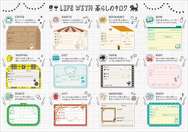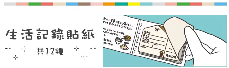 KINGJIM特別開發「生活記錄便利貼」,共有12種不同主題,包含咖啡,甜點,購物,育嬰,運動,禮物,手工等。