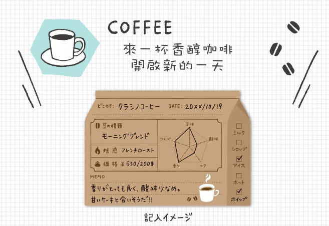 而且貼紙外觀也設計有如咖啡豆紙包,角落的一杯小小咖啡,隨手寫都可愛美觀。
