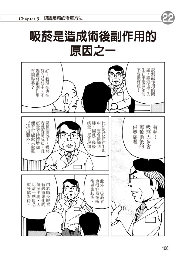1、專科醫生化身漫畫主角,帶領讀者在一篇漫畫搭配一則解說之中,逐項累積肺癌的關鍵知識。